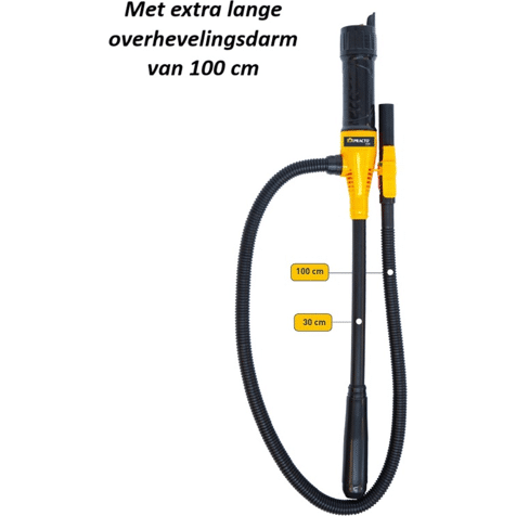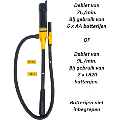 Deze veelzijdige overhevelingspomp, inclusief handige batterijadapter, is perfect om snel en efficiënt water, benzine of andere niet-corrosieve vloeistoffen over te pompen. Met een debiet van 9l per minuut bij gebruik van 6 AA-batterijen, biedt de pomp beiden snelheid en gemak. Opgelet: de batterijen zijn niet inbegrepen.